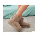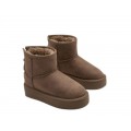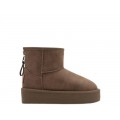 Corte realizado en material sintético con tecnología repelente al agua, cuenta con cremallera trasera y logo de la marca en la parte trasera, forro interior de pelo con plantilla textil y plataforma con suela de goma muy adherente y flexible.