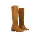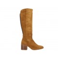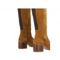 Corte realizado en piel serraje con punta afilada, la caña de 34 cm dispone de un elástico en la parte trasera que se adapta a la pierna a la perfección, forro interior de piel, cierre mediante cremallera, tacón ancho de 6 cm de altura muy fácil de llevar y suela sintética muy ligera y flexible.