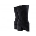Corte fabricado en piel natural forro interior textil con acabado aterciopelado, cierre de cremallera lateral, tacón ancho de 6.5 cm con suela antideslizante. Altura de la caña 21 cm con detalle de corte en V. Fabricación española.