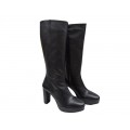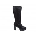 Corte realizado en piel con punta redonda y caña de 33, forro interior con plantilla acolchada vegana, cierre mediante cremallera, tacón ancho de 9 cm de altura muy fácil de llevar y suela sintética muy ligera y flexible.
