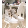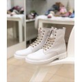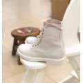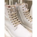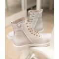 Bota de piel Beberlis modelo 22041-B en color hielo para niña o chica. Corte fabricado en piel natural con detalle de estrella en la lengüeta en color oro, forro interior de piel que aporta un tacto suave y una correcta transpiración, cierre mediante cremallera lateral y cordones en color hielo y oro, la suela es de goma de gran adherencia. Fabricación española.