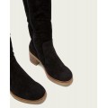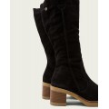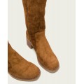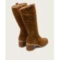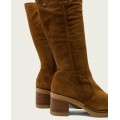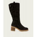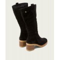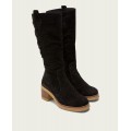 Bota de tacón Diane Porronet 4436 en color negro o cuero para mujer. Corte realizado en piel serraje con altura de caña 30 cm, forro interior textil con acabado aterciopelado muy suave y calentito, cierre mediante cremallera lateral, suela crepé con tacón ancho de 7cm. Hecho en España.