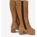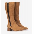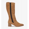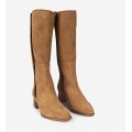 Bota con tacón bajo de Popa modelo 036 Ayse en color cuero para mujer. Corte realizado en piel serraje con punta afilada, la caña de 33.5 dispone de un elástico lateral que se adapta a la pierna a la perfección, forro interior de piel, cierre mediante cremallera, tacón ancho de 5 cm de altura muy fácil de llevar y suela sintética muy ligera y flexible.