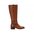 Corte realizado en piel con detalle de correa con hebilla en el lateral, forro interior de piel natural de excelente tacto y transpiración, caña alta de 37 cm de altura y suela sintética con tacón ancho de 4 cm.