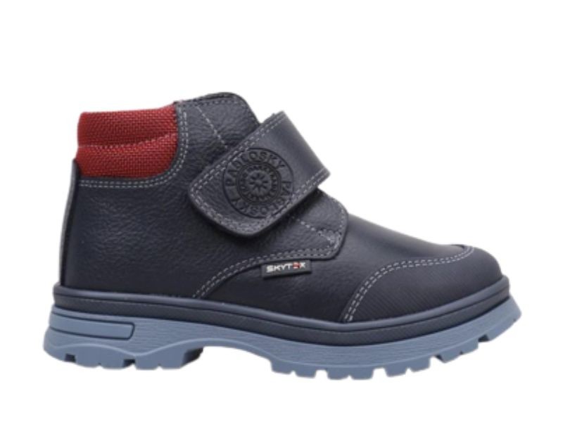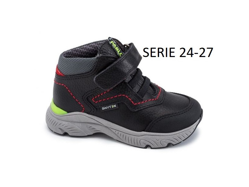 Corte realizado en piel con tratamiento hidrofugado y refuerzo de goma en la puntera, forro interior con membrana skytex impermeable, cortavientos y transpirable, para el óptimo confort térmico del pie, cierre mediante velcro muy fácil de poner y quitar, piso de goma antideslizante y de alta resistencia, que incorpora las exclusivas tecnologías superflex, que favorece la flexión normal del pie, y airbag amortiguador de pisada. Cuenta con horma fisiológica para el correcto crecimiento y desarrollo del pie.