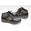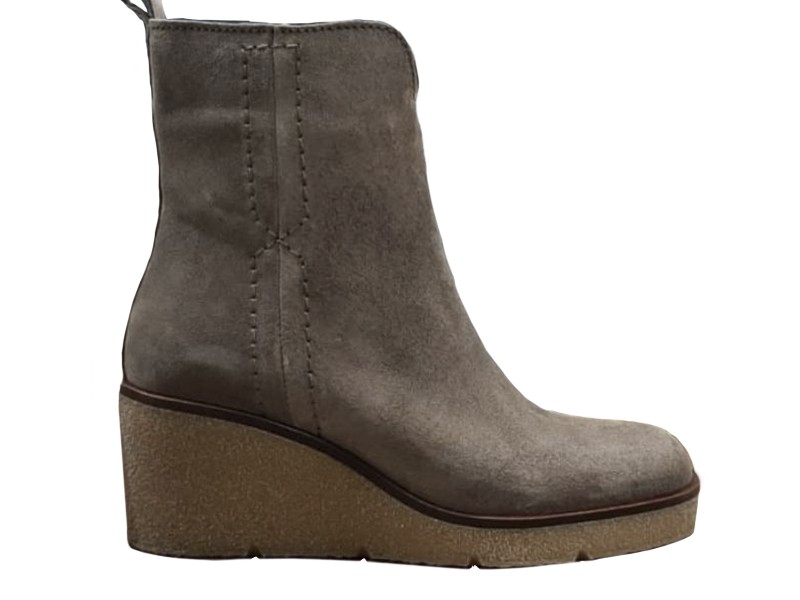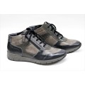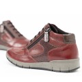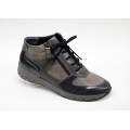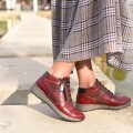 Botín plano de Suave by Leyland modelo 3900 en color negro, granate o burdeos, corte realizado en piel combinada granate - taupe y negro - gris con distintos acabados, el forro interior es textil con plantilla antómica extraíble lavable a 30 grados, cierre mediante cordones y cremallera lateral, suela de goma flexible y adherente.