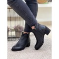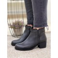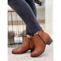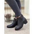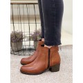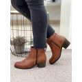 Botín de piel con tacón bajo Manlisa modelo W332-7434 en color negro o cuero para mujer. Corte hecho en piel natural con detalle de coco charol en el lateral, forro interior textil calentito con plantilla de piel, cierre mediante cremallera, tacón ancho de 5 cm y suela sintética muy flexible con gran adherencia.