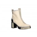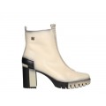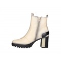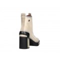 Corte realizado en piel natural con puntera redonda. forro interior de excelente transpiración con plantilla extraíble, cierre mediante cremallera lateral, tacón ancho de 7.5 cm de altura combinado con plataforma de 2 cm en tono beige y negro, la suela es de goma con gran adherencia y flexibilidad. Hecho en España.