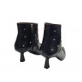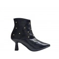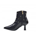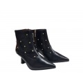 Corte realizado en piel muy suave decorado con tachuelas en color oro, diseño de puntera afilada muy elegante, forro interior y plantilla de piel, cierre mediante cremallera y suela sintética con gran adherencia con tacón fino de 6 cm de altura.