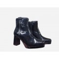 Corte realizado en piel charol con detalle de hebilla en la caña, forro de piel natural muy transpirable y de tacto muy suave, cierre mediante cremallera en el empeine, tacón ancho de 7.5 cm de altura y suela de material sintético muy flexible y adherente.