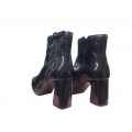 Botín de piel con tacón ancho T8 Virus en color negro charol para mujer. Un fondo de armario que no te puede faltar este invierno, resulta muy versátil y combina fácilmente con infinidad de outfits. Su tacón ancho de 7.5 cm nos aporta esos centímetros que tanto nos favorecen.