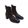 Corte realizado en tejido elástico ante Lycra con estampado animal print y puntera en charol, forro interior textil con plantilla anatómica extraíble, cierre mediante cremallera, tacón ancho de 4.5 cm de altura, suela antideslizante en material sintético muy ligero.