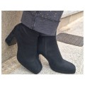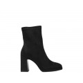 Corte realizado en antelina elástica con diseño de puntera cuadrada, forro interior textil con plantilla new gel que ofrece un extra de confort, cierre mediante cremallera, tacón ancho de 9 cm y plataforma de 1.2cm con suela sintética muy ligera y flexible.