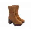 Corte fabricado en piel serraje, forro interior textil con acabado aterciopelado, cierre de cremallera, tacón ancho de 8.5 cm y plataforma de 2.5 cm con suela sintética muy ligera. Fabricación española.