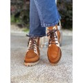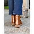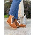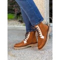 Botín estilo militar Crissi de la marca Salonissimos en color cuero. Corte realizado en piel serraje con detalles en piel charol color beige en la cordonera y talón haciendo contraste, forro interior textil con plantilla de piel, cierre mediante cordones y cremallera lateral, la suela es de material sintético con piso dentado.