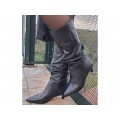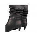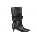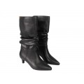 Corte realizado en piel napa negro con diseño de punta afilada, forro interior textil con plantilla acolchada, sin cremallera, caña arrugada con una altura de 28cm y tacón fino de 5cm con suela sintética muy ligera y flexible.