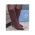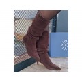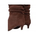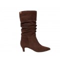 Corte realizado en piel serraje marrón con diseño de punta afilada, forro interior textil con plantilla acolchada, sin cremallera, caña arrugada con una altura de 28cm y tacón fino de 5cm con suela sintética muy ligera y flexible.