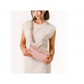 Bolso tipo bandolera con forma rectangular en color gris o rosa, elaborado en materiales reciclados. Cuenta con una práctica bandolera de tejido que puede regularse y es de quita y pon. El cierre es de solapa.
