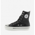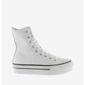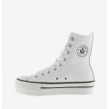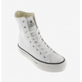 Botín tipo basket de Victoria modelo 1061120 en color blanco o negro. Corte realizado en tejido sintético efecto piel con puntera de goma, forro interior textil, cierre mediante cordones al tono, plataforma de 4 cm y caña de 14 cm de altura, la suela es de goma flexible y adherente.