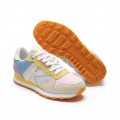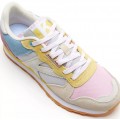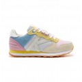 Corte realizado en serraje y material textil combinando diferentes colores y acabados, con forro interior textil y plantilla extraíble, cierre mediante cordones, refuerzo en la talonera para mayor agarre del pie y suela de material sintético muy adherente.