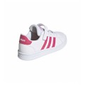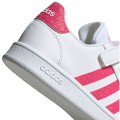Deportivo Adidas Grand Court C EG3811 en color blanco-fucsia. Corte realizado en piel sintética con detalle de las tres bandas en fucsia, forro interior textil con plantilla extraíble acolchada, cierre mediante cordones elásticos y velcro, la suela es de material sintético adherente y flexible.