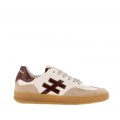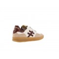 Corte realizado en piel con refuerzos de ante en la puntera y detalles en color marrón, logo de la marca y pieza del talón haciendo contraste, forro interior textil con plantilla extraíble, cierre mediante cordones y suela sintética muy ligera y adherente.