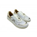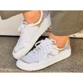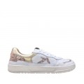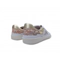Corte realizado en piel natural con piezas en color dorado y glitter multicolor, puntera redonda, sin contrafuerte, forro interior de piel que nos asegura una buena transpiración, cierre mediante cordones, suela sintética plana sin drop.