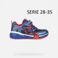 Deportivo Supider-man Bayonyc para niño de Geox J26FEB en color azul-rojo. Corte bajo realizado en material sintético y textil con ilustración del personaje Spider-man, forro interior fabricado en material sintético y piel natural con plantilla extraíble libre de cromo y antibacterias, cierre mediante velcro ajustable y cordones elásticos, suela sintética con luces que se acccionan en cada pisada con tecla de On/Off para encender según convenga. Dispone de la tecnología Geox respira para ofrecer la transpiración correcta.