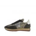 Corte realizado en nylon y serraje con detalles en animal print, forro interior textil con plantilla acolchada para mayor comodidad, cierre mediante cordones, suela tostada y patín dentado en verde para favorecer un mejor agarre.