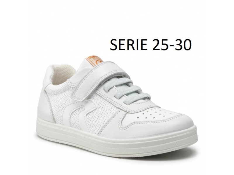 Deportivo de piel Primigi modelo 187602 en color blanco unisex. Corte realizado en piel con picados en la pala, forro interior textil para una excelente transpiración, la plantilla es anatómica extraíble forrada en piel, cierre mediante cordones elásticos y velcro ajustable, la suela es de goma con shock absorber en el talón para amortiguar la pisada. Un zapato perfecto para los primeros pasos que asegura un correcto desarrollo y crecimiento del pie.