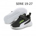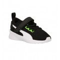 Deportivo para niño de la marca Puma modelo Flyer Runner V Inf 192930 en color negro-verde. Corte realizado en malla textil con tirador en el talón para facilitar el calce, forro interior textil con plantilla acolchada, cierre mediante velcro y cordones elásticos para un buen ajuste, suela sintética de gran adherencia. Calzado para niños.