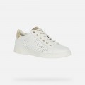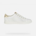 Deportivo para mujer Geox Jaysen D151BB en color blanco. Corte realizado en piel con picados en los laterales y detalles en dorado, forro interior textil con plantilla extraíble de piel, cierre mediante cordones y suela de goma con la tecnología Geox respira que combina la suela perforada y una resistente membrana transpirable e impermeable que permite la regulación natural de la temperatura.