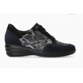 Sneakers Mephisto modelo Sharaona en color marino para mujer. El corte combina varios acabados charol, cuero nobuck y serraje, forro interior de piel con plantilla de piel extraíble, cierre mediante cremallera lateral y cordones y suela de caucho muy ligera con una cuña de 3 cm con shock absorber para amortiguar la pisada.