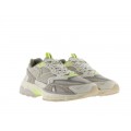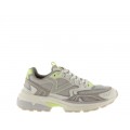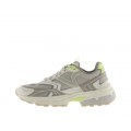 Corte realizado en malla textil y piel con diferentes colores y acabados, forro interior textil con gran transpiración y plantilla extraíble, cierre mediante cordones y suela de volumen Mythos de gran adherencia y flexibilidad con una altura de 3.5 cm.