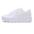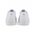 Deportivo para niña Puma Karmen L PS 387375 en color blanco. Corte realizado en material sintético con logotipo de puma en plateado, forro interior textil con plantilla extraíble para una mejor limpieza e higiene, cierre mediante cordones al tono y suela de goma con plataforma de 3.5 cm.
