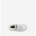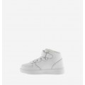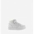 Deportivo alto tipo botín Tiempo de Victoria modelo 1124107 en color blanco para niño y niña. Corte fabricado en piel vegana con la pala perforada para favorecer la transpiración, forro interior textil con la plantilla acolchada, cierre mediante velcro y cordones elásticos, suela de caucho muy adherente y flexible.