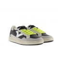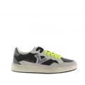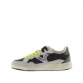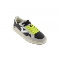 Corte realizado en piel natural con talón en acabado glitter, forro interior textil de excelente transpiración con plantilla ergonómica, cierre mediante cordón disponible en dos colores amarillo fluor o gris, suela de caucho 100% acabado envejecido con textura rugosa.