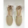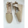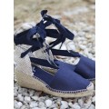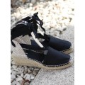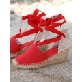 Corte realizado en material textil con pala lisa y cuerda para atar por la pierna al tono, suela de esparto con una cuña de altura 6.5 cm muy fácil de llevar, piso de goma muy adherente y flexible.