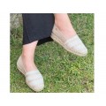 Corte realizado en material textil con bonito ribeteado en tonos beige, forro interior textil con plantilla acolchada, sin cierre con suela de yute natural. Hecho en España.