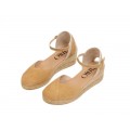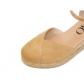 Corte realizado en ante con escote en pico y talonera, forro interior y plantilla de piel natural para una buena transpiración, cierre mediante pulsera con hebilla ajustable, cuña de 5 cm de altura y plataforma de 1.5 cm en yute natural, la suela es de caucho muy adherente y flexible.