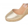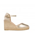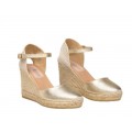 Las alpargatas Global de Gaimo en color oro son el equilibrio perfecto entre diseño, comodidad y sofisticación. Confeccionadas artesanalmente en España, presentan un corte cerrado en piel grabada, talonera con cierre de hebilla al tobillo y cuña de yute ecológico.