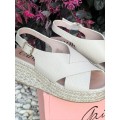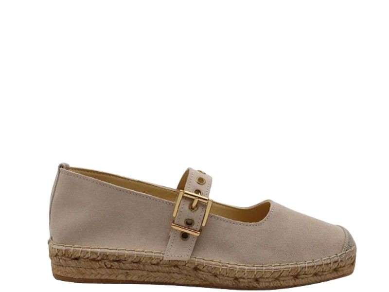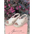Alpargata de cuña Nana de Gaimo en color hielo para mujer. Diseño con punta cuadrada y tiras anchas entrelazadas, forro y plantilla de piel natural para una excelente transpiración, cierre mediante hebilla ajustable en el lateral, cuña de yute natural con una altura de 6 cm y plataforma de 2.5 cm, suela 100% caucho natural.