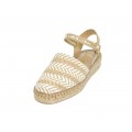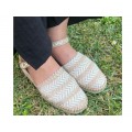 Corte realizado en material textil con bonito ribeteado en tonos beige, forro interior textil con plantilla acolchada, cierre mediante pulsera con hebilla ajustable y suela de yute natural. Hecho en España.