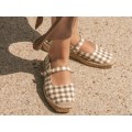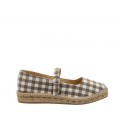 Corte realizado en material textil con estampado vichy, forro interior textil, cierre mediante trabilla con hebilla ajustable, plataforma de yute de 3 cm con suela sintética muy flexible y adherente.