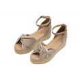 Corte realizado en piel natural en acabado ante taupe, forro interior y plantilla de piel natural con buena transpiración, cierre mediante pulsera en el tobillo con hebilla ajustable, plataforma de yute de 4.5 cm de altura con suela de caucho muy flexible y adherente.