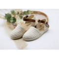 Alpargata para niña Chispas modelo Foque-G60 en color lino. Pala textil con rayas marineras, forro interior textil con plantilla acolchada y fácil de lavar, cierre mediante hebilla ajustable con correa en tono cuero y suela de caucho adherente y flexible revestida de yute.