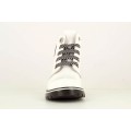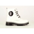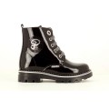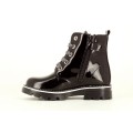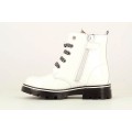 Bota militar Pablosky modelo 489808 en color blanco o negro para niña. Corte realizado en charol, forro sin costuras, una microfibra 7 veces más absorbente que la piel, neutro y resistente al roce, plantilla de piel amortiguadora y antibacterias, cierre mediante cremallera lateral y cordones, piso de goma antideslizante y de alta resistencia, que incorpora las exclusivas tecnologías superflex, que favorece que la flexión normal del pie, y Airbag amortiguador de pisada.