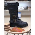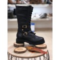 Bota de estilo militar Exe modelo 686K en color negro. Corte realizado en piel natural con detalle de tiras con hebillas en color dorado, forro interior de piel y material textil de excelente transpiración, cierre mediante cordones y cremallera para lograr el ajuste correcto a la pierna, suela de material sintético muy ligera y flexible con gran adherencia. Altura de la caña 30 cm.