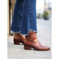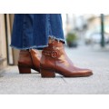 Botín de piel Plumers modelo 5451 disponible en color cuero y negro. Corte liso realizado en piel de primera calidad muy suave que se adapta al pie a la perfección con detalle de círculo metal en el lateral, forro interior de piel para una excelente transpiración, cierre mediante cremallera lateral, suela sintética muy ligera y de gran adherencia con tacón ancho de 5.5 cm.