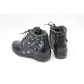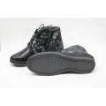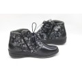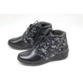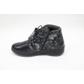 Botín plano de piel Suave modelo 3601 en color negro. Corte realizado en piel natural con estampado de flores a modo decorativo, tiene una horma muy ancha perfecta para pies delicados y anchos, el forro interior es de borreguito muy cálido, la plantilla también está forrada y es extraíble para un mejor limpieza e higiene, el cierre es mediante cremallera y cordones para el perfecto ajuste, suela de goma muy adherente y flexible.